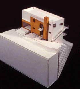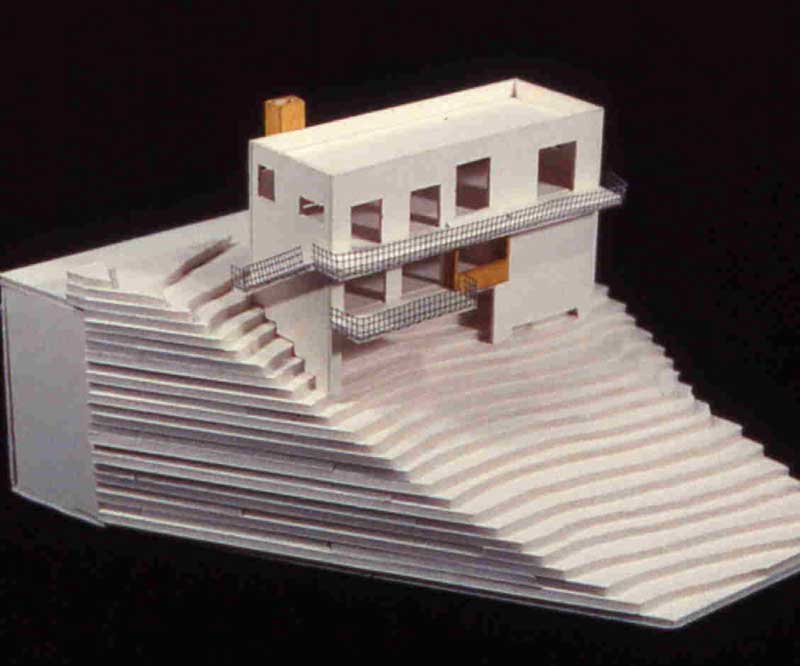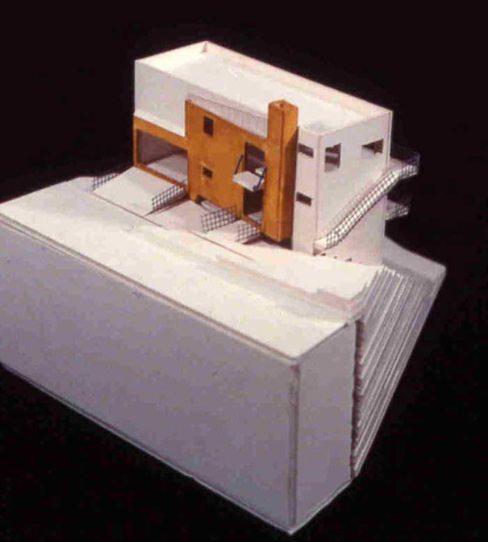 The program for this 1,750 square foot residence with two car attached garage situated on a steeply sloping lot called for 3 bedrooms with baths, living and dining areas and kitchen on a minimal budget. The solution employs caissons and grade beams for the foundation system to minimize grading operations, thus costs and uses simple architectural forms enriched by designing with an additive process. The result efficiently accommodates the program providing generous light, air and views.